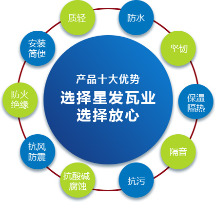 公司主要產(chǎn)品有《星發(fā)牌》合成樹脂瓦、APVC防腐耐候復合瓦、APVC發(fā)泡隔熱瓦、PVC半透明瓦、PVC防腐隔熱瓦、PVC防腐瓦、PVC防腐平板、PVC條紋板和ASA/PVC超耐候復合瓦等產(chǎn)品。產(chǎn)品一經(jīng)推出,已被廣泛應用于國內各類平改坡項目和大型工業(yè)項目,遠銷歐洲、亞洲、美洲和非洲等國外市場,還獲選為廣州亞運會、深圳大運會、四川災后重建等工程項目的應用產(chǎn)品。公司在不斷創(chuàng)新和改革的基礎上,力求以更好的產(chǎn)品、優(yōu)良的服務,用心、專心服務好每一個客戶。
